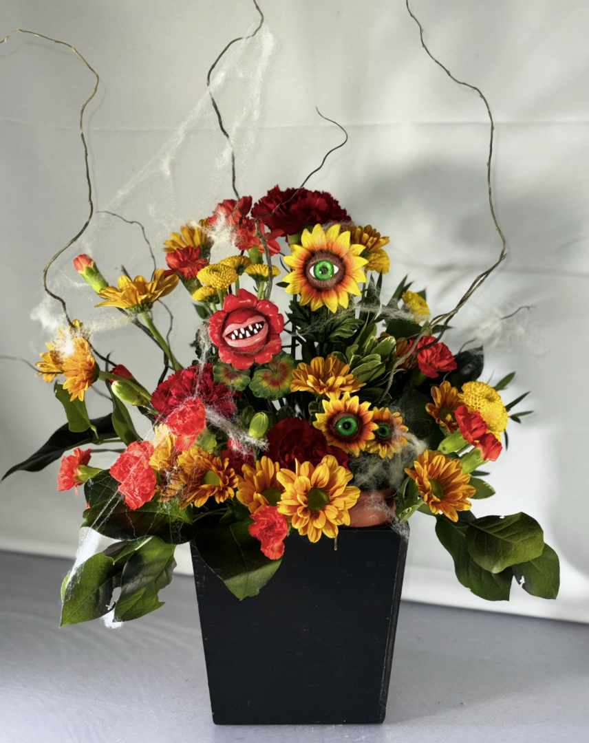 A spooky fall-colored arrangement that looks back at you!