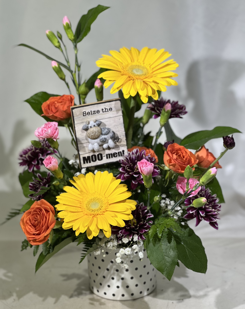 Brightly-colored gerbera and chrysanthemum daisies, spray roses and miniature carnations accented with baby’s breath in a polka-dot container. Customize the trinket when you order!