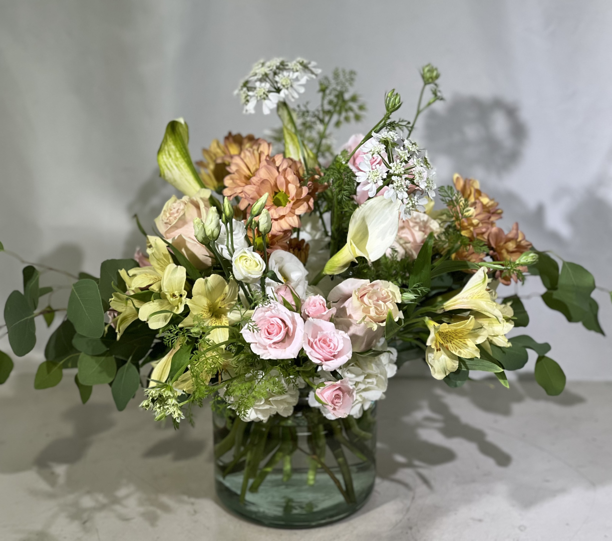 Gorgeous compact design including mini calla lilies, roses, chrysanthemum daisies, and alstroemeria nestled in a hydrangea with accenting greenery.