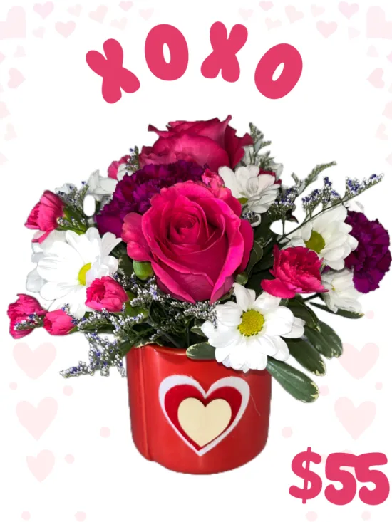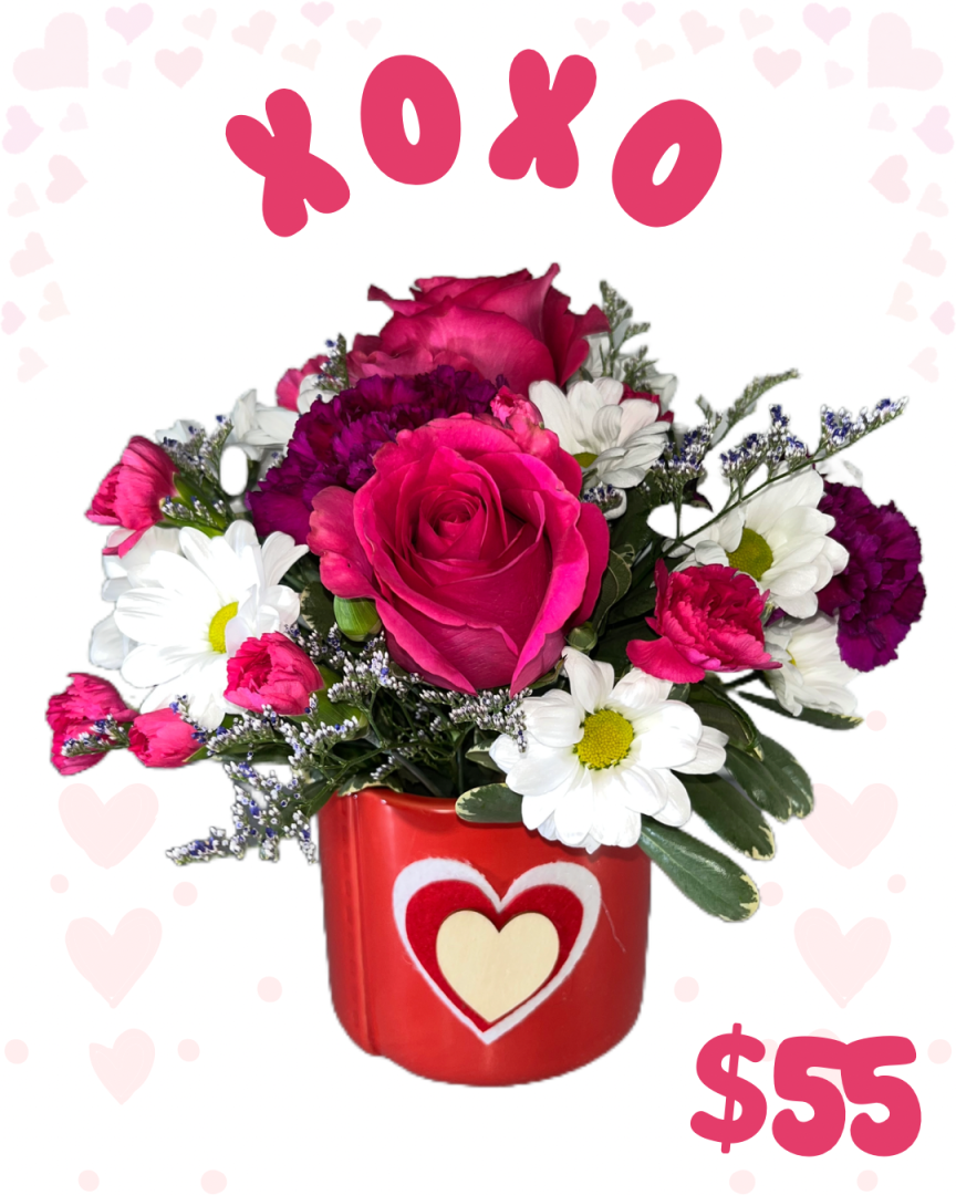 valentine color scheme in an assortment of fresh flowers designed in a ceramic container adorned with a felt heart