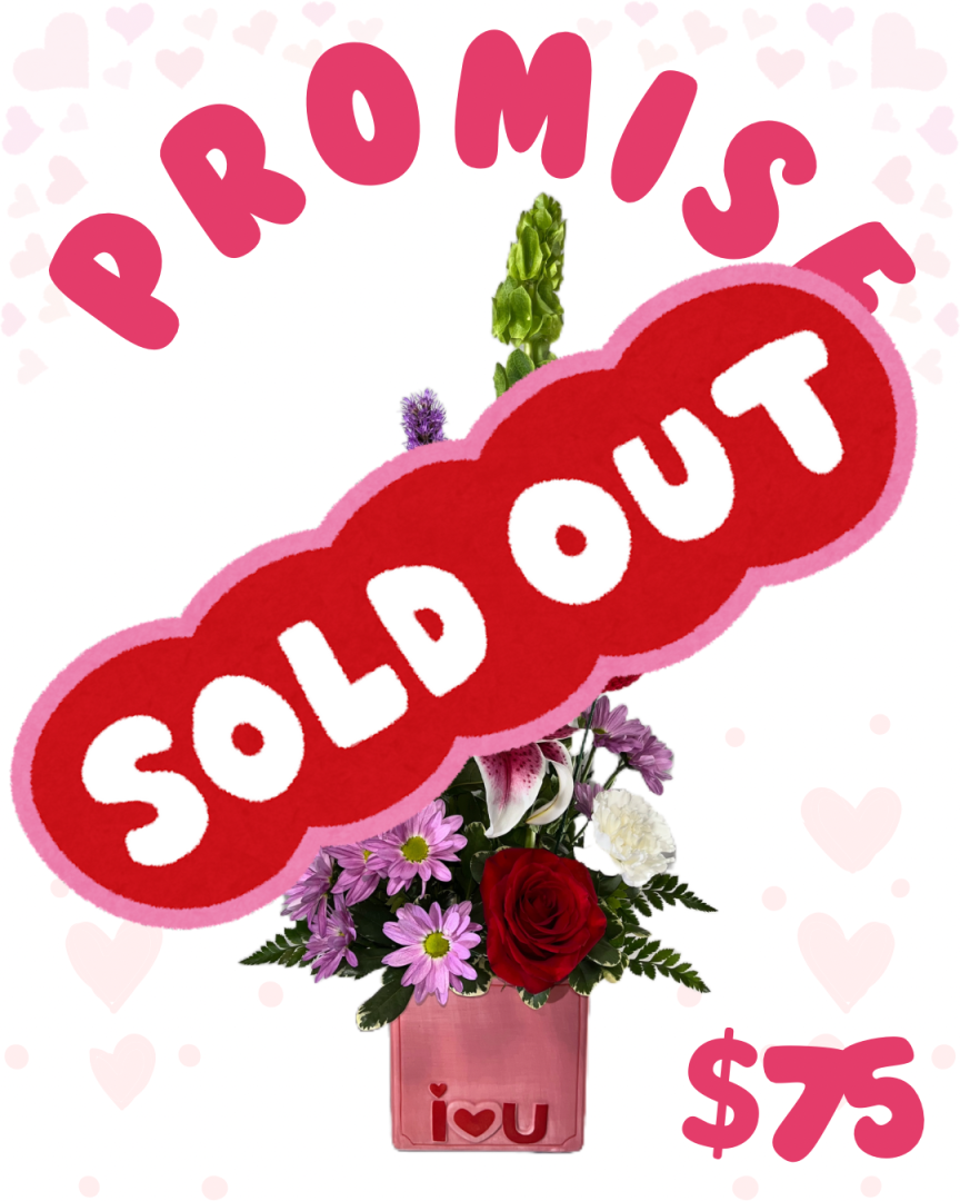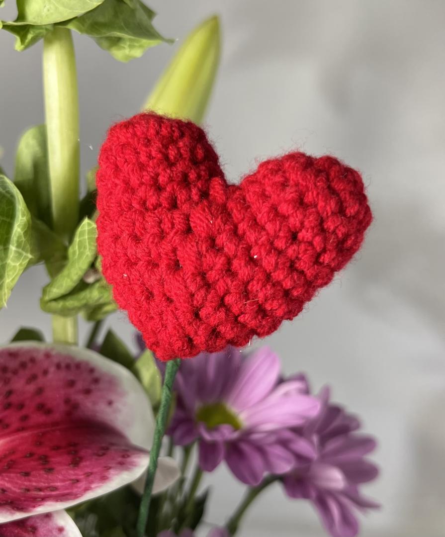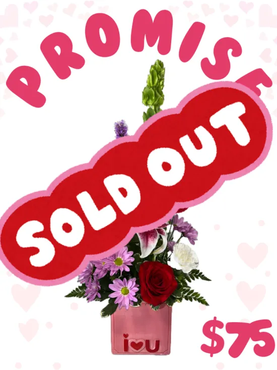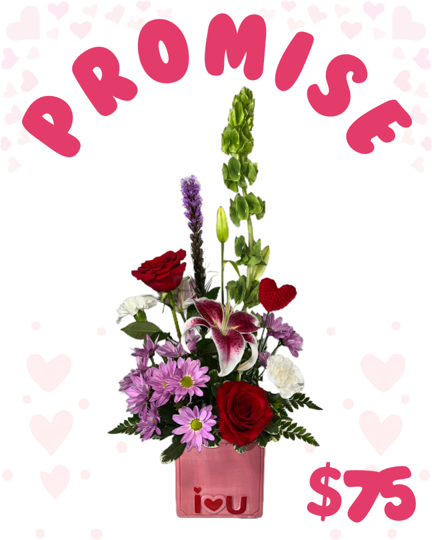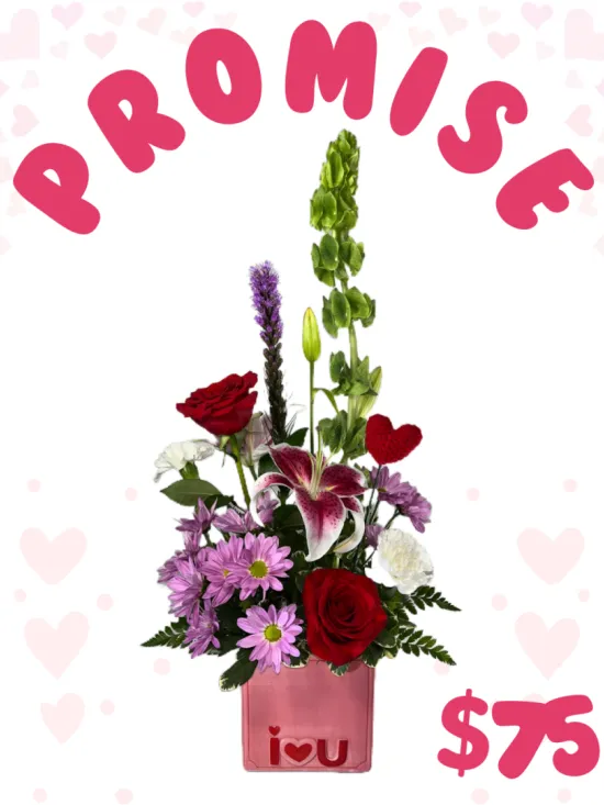 valentine color scheme in an assortment of fresh flowers designed in a ceramic “I ❤️ U” vase