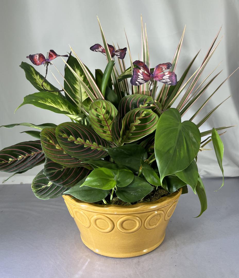 dish garden or assorted green plants in a ceramic planter decorated for Valentine's Day